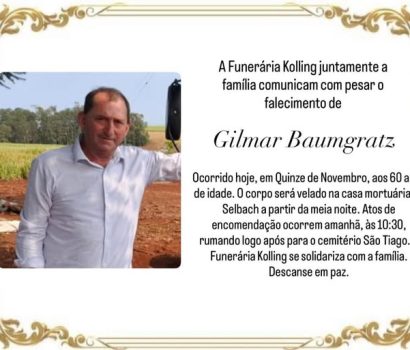 A emissora Rádio Princesa FM comunica, com muito pesar, o falecimento de Gilmar Baumgratz, nosso ex-colaborador e amigo, aos 60 anos de idade. O corpo está sendo velado na casa mortuária de Selbach. Atos de encomendação ocorrem hoje, 12 de Fevereiro, ás 10:30, rumando logo após para o cemitério São Tiago. IMAGEM: Funerária Kolling SIGA …