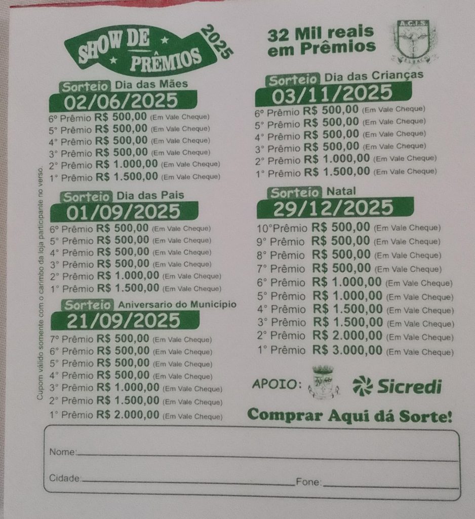 Associação comercial e industrial de Selbach brinda vc com o show de prêmios 2025 são mais de 30 mil em prêmios divididos em 5 sorteios durante o ano. Compre nas empresas associadas na Acis e ganhe seu cupom. Valorizamos o comércio selbachense. Comprar aqui da sorte .