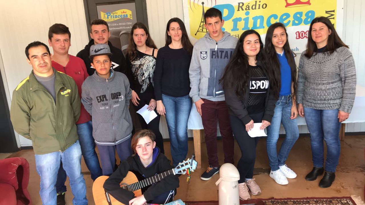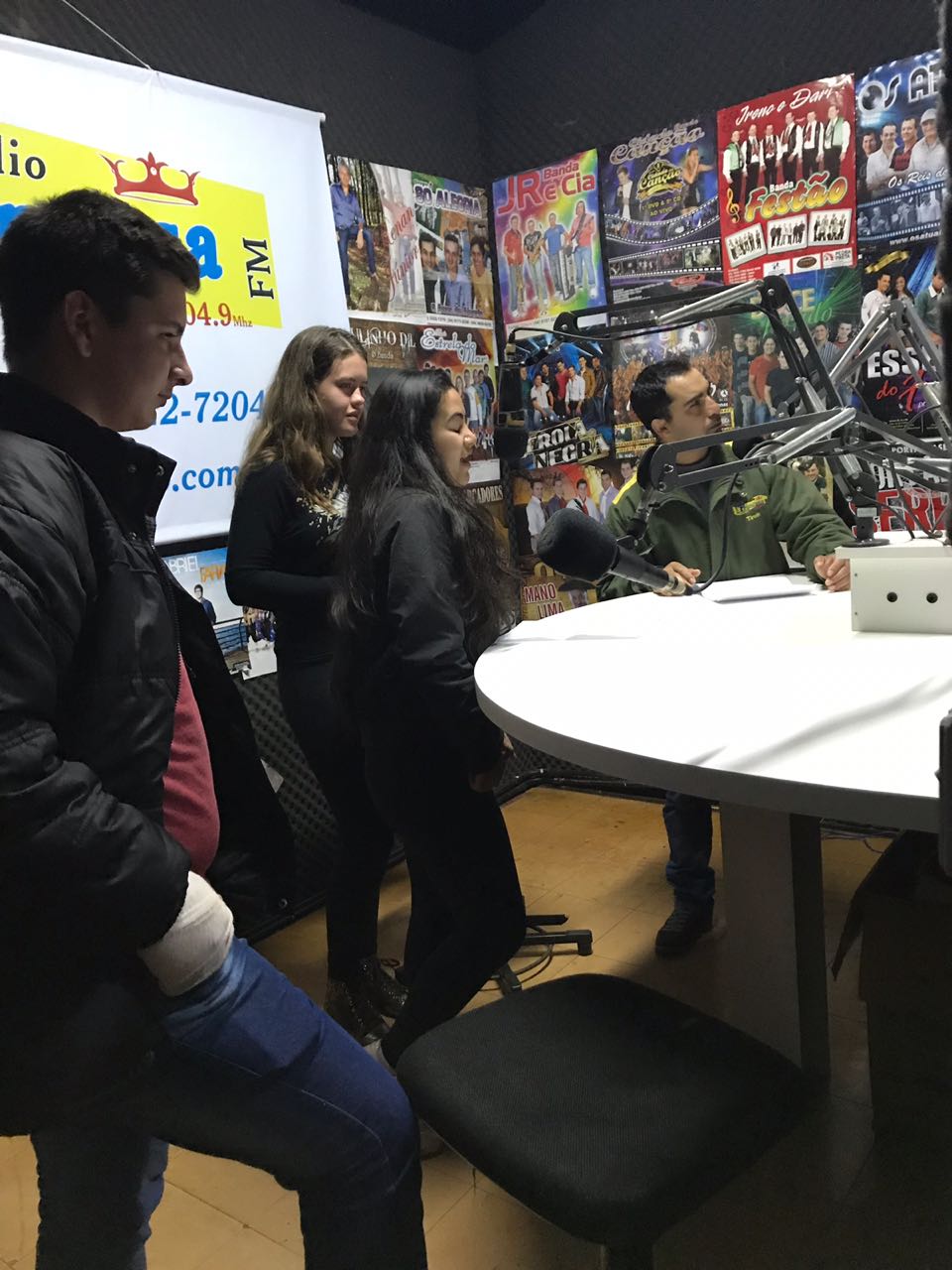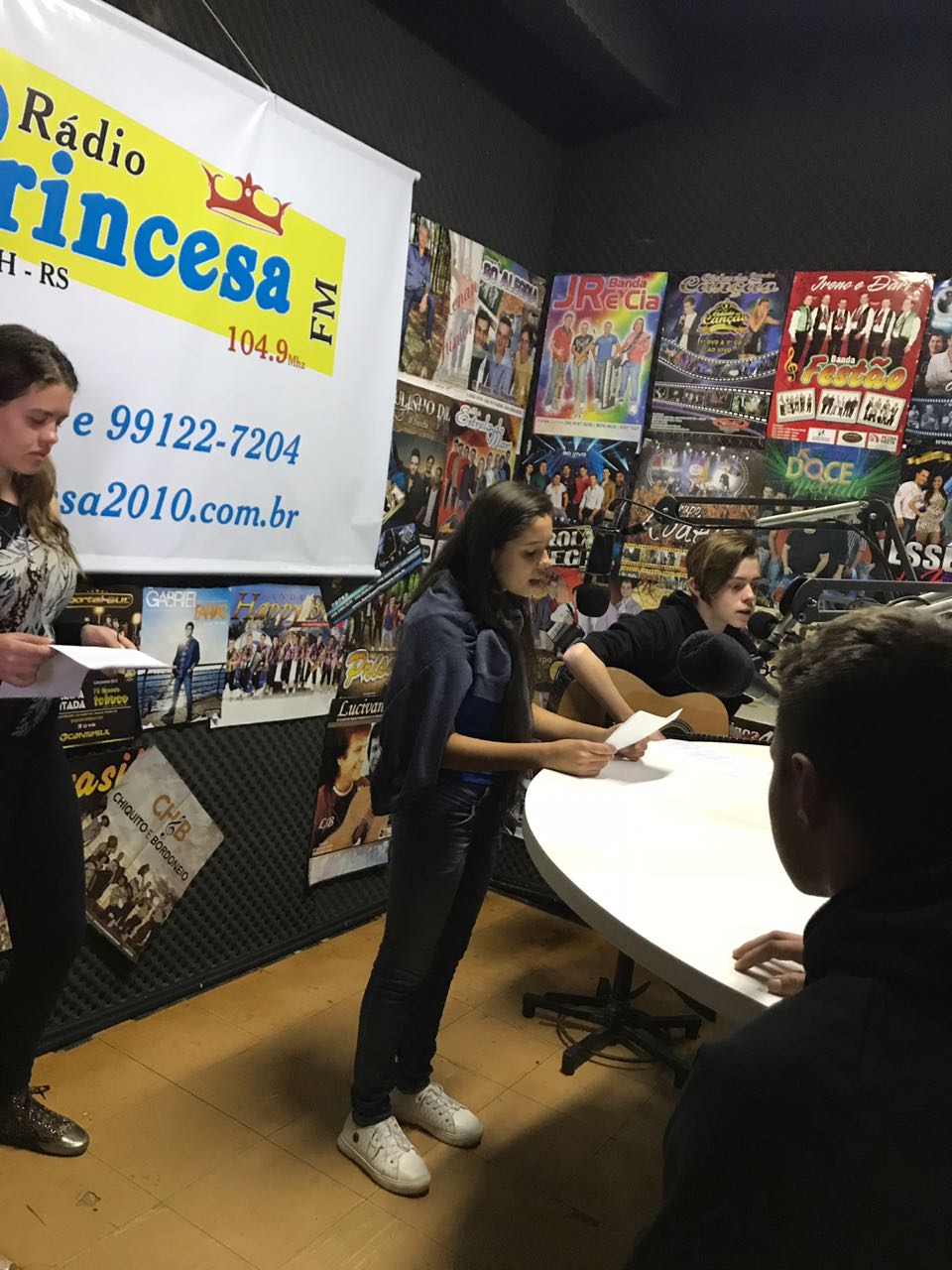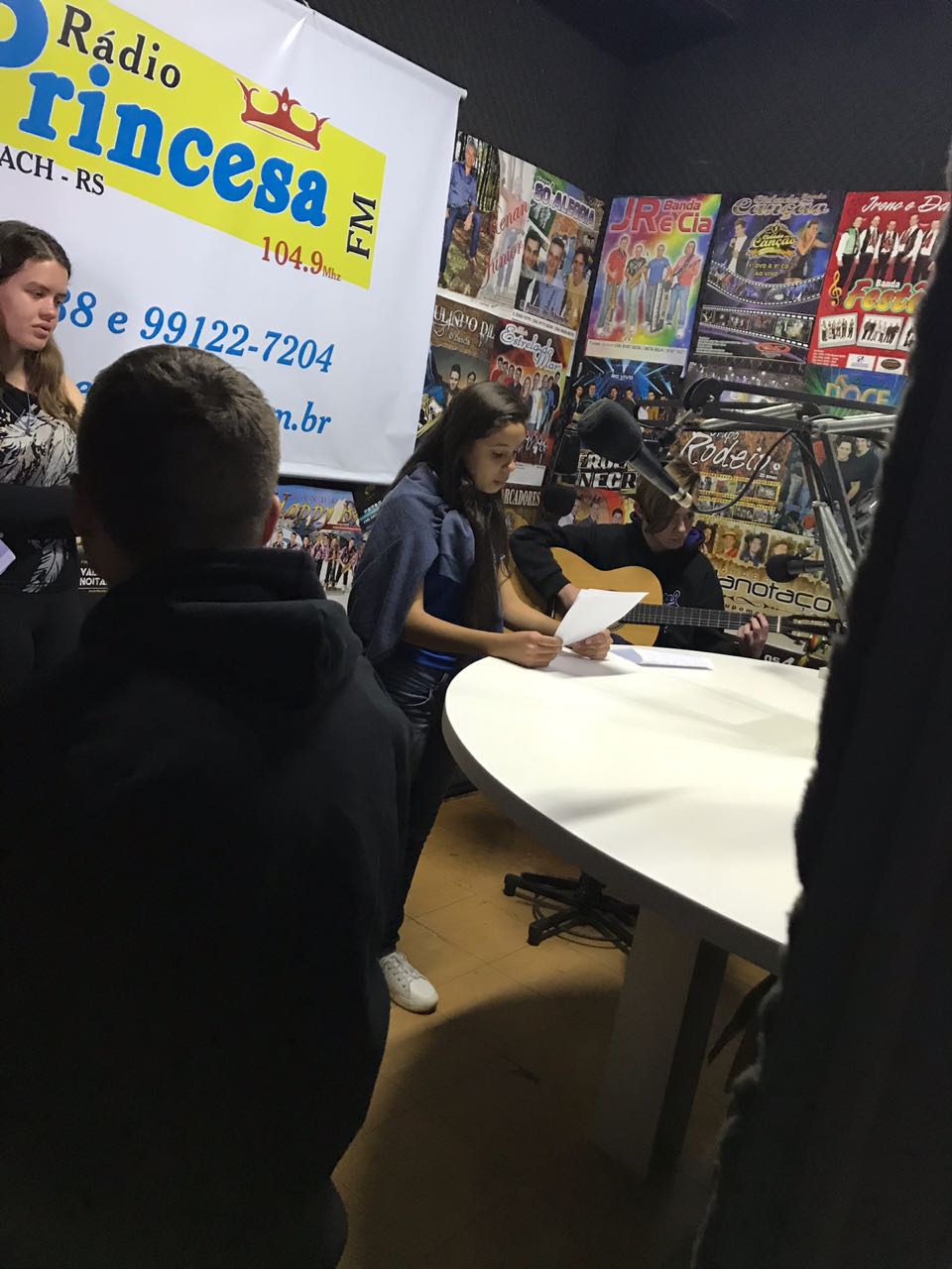 Nesta manhã os alunos do 8º ano da EMEF Aníbal Magni estiveram participando do Projeto Rádio Escola. Iniciaram sua participação falando sobre todas as datas comemorativas do mês de agosto, dia do estudante comemorado no dia 11 e também o dia dos pais. Os alunos participantes apresentaram uma canções e também um poema.