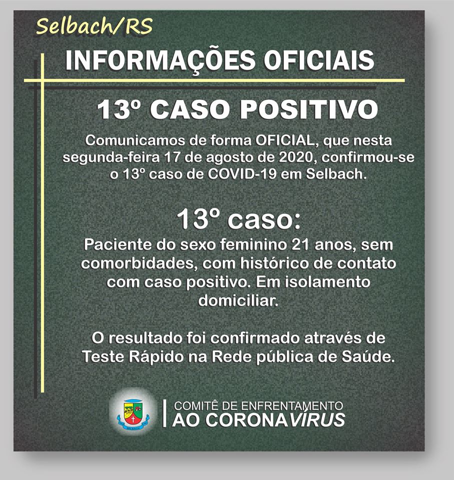 GeralSelbach informa 13º caso de Covid-19 no municípiopor Radialistas Princesa FMatualizado em 17/08/202017/08/2020Deixe um comentário em Selbach informa 13º caso de Covid-19 no município Veja Também:Reinauguração Complexo Esportivo do MunicípioCães e gatos são envenenados em SelbachUma pessoa moradora de Selbach é portadora de leptospiroseDeputado Heitor Schuch visita cidade de SelbachPedágio do Lions Club em SelbachAções de Selbach contra a dengue