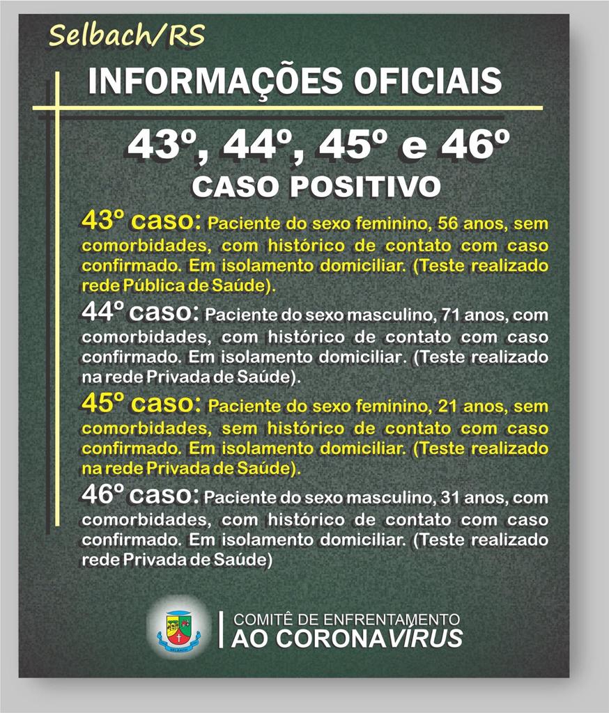 GeralSelbach informa mais 04 casos positivados e número total chega a 46por Radialistas Princesa FMatualizado em 04/09/202004/09/2020Deixe um comentário em Selbach informa mais 04 casos positivados e número total chega a 46 Veja Também:Uma pessoa moradora de Selbach é portadora de leptospiroseDeputado Heitor Schuch visita cidade de SelbachPedágio do Lions Club em SelbachAções de Selbach contra a dengueExtensionista rural da Emater de Selbach fala sobre…Presidente do coral Renascer da melodia convida para…