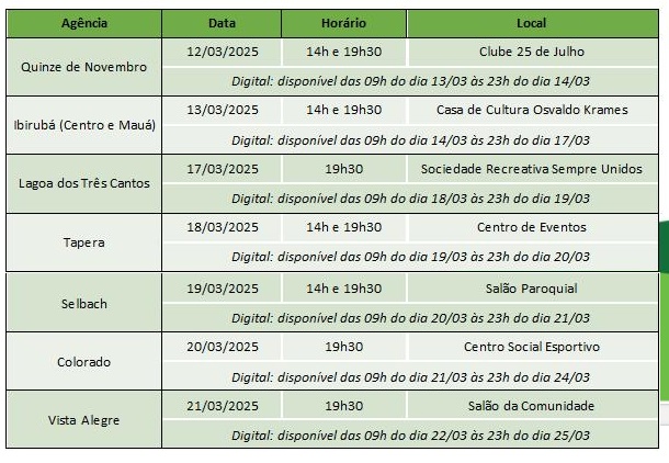 Os encontros são importantes oportunidades para que os associados coloquem em prática o seu papel de dono, exercendo por meio do voto a sua participação nas definições pautadas para este ciclo. Para as Assembleias 2025, a Sicredi Rota das Terras RS/MG, realizará seus encontros em formato presencial e digital no Rio Grande do Sul, de 12 a 25 de março (ver calendário abaixo), e digital em Minas Gerais, de 24 a 31 de março.