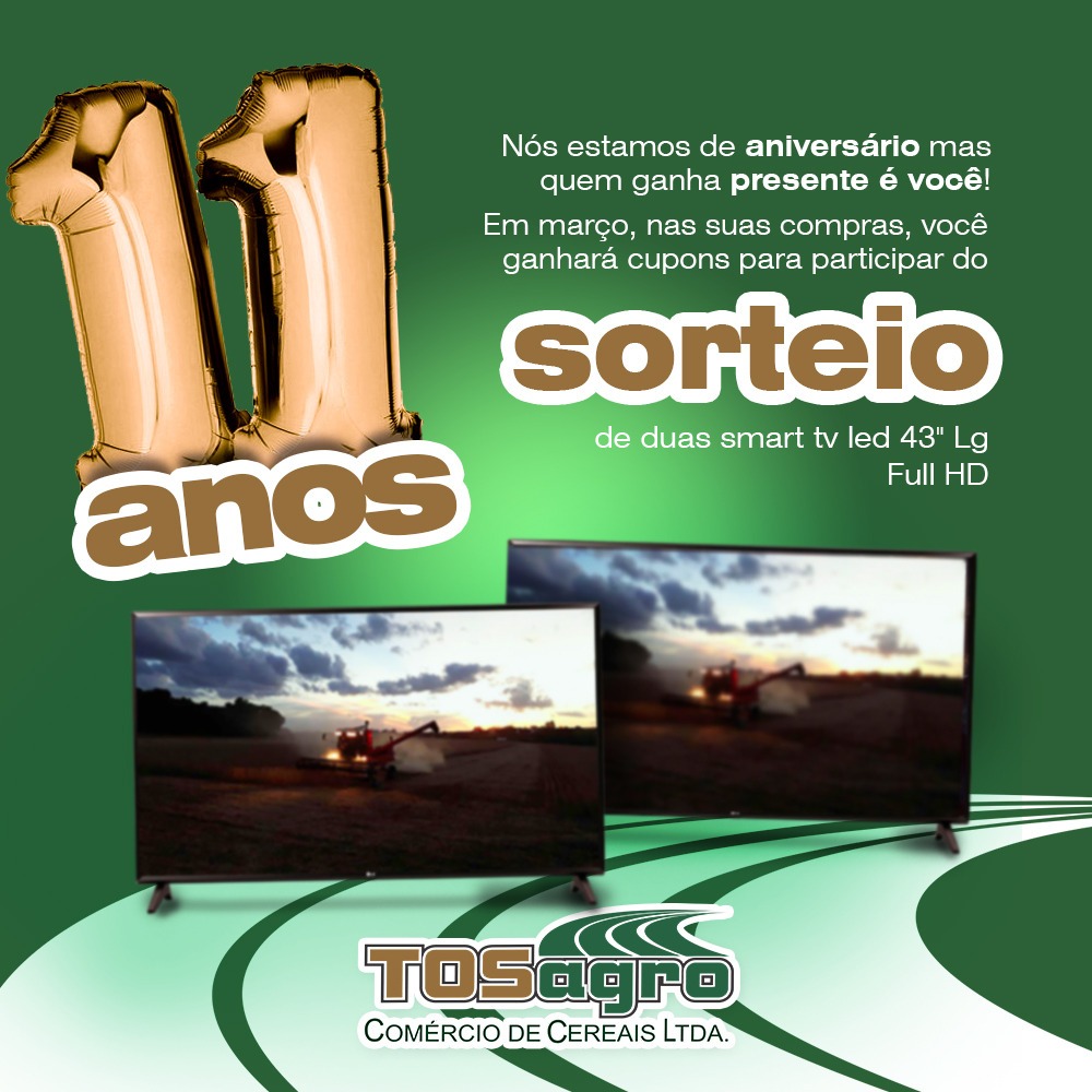 Durante todo o mês de março, comprando e negociando na TOSagro você ganhará cupons para concorrer a duas smart TV led 43’.